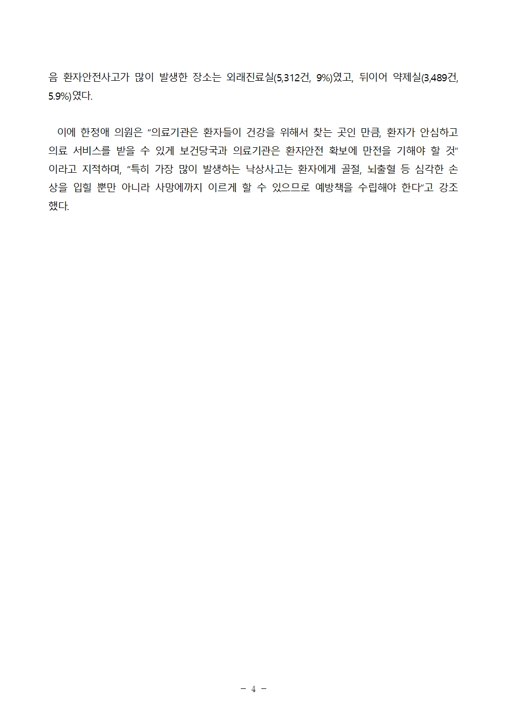 한정애 의원은 “의료기관은 환자들이 건강을 위해서 찾는 곳인 만큼, 환자가 안심하고 의료 서비스를 받을 수 있게 보건당국과 의료기관은 환자안전 확보에 만전을 기해야 할 것”이라고 지적하며, “특히 가장 많이 발생하는 낙상사고는 환자에게 골절, 뇌출혈 등 심각한 손상을 입힐 뿐만 아니라 사망에까지 이르게 할 수 있으므로 예방책을 수립해야 한다”고 강조했다.
