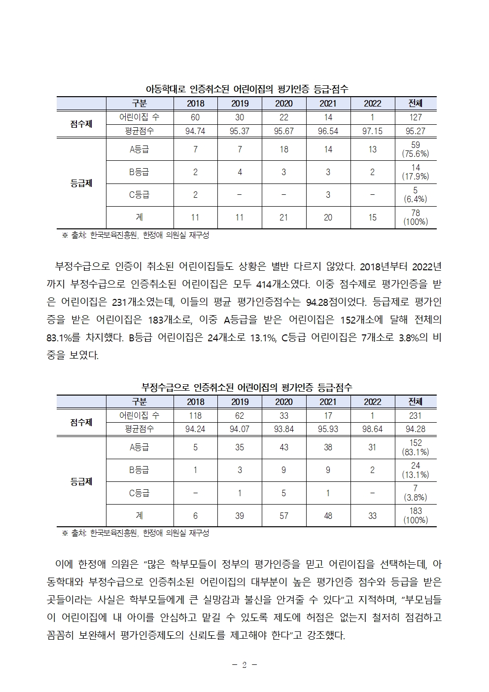 [보도자료] 아동학대로 인증 취소된 어린이집 8할이 A등급