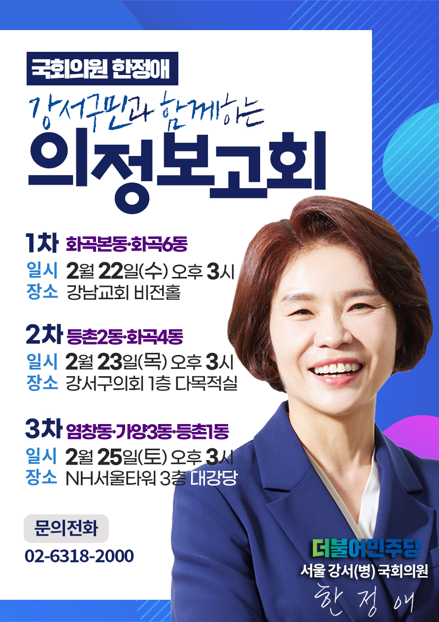 오는 22일(수)을 시작으로 23일(목), 25일(토)까지 총 3회에 걸쳐 진행되는 의정보고회에 강서 구민 여러분을 초대합니다 :)