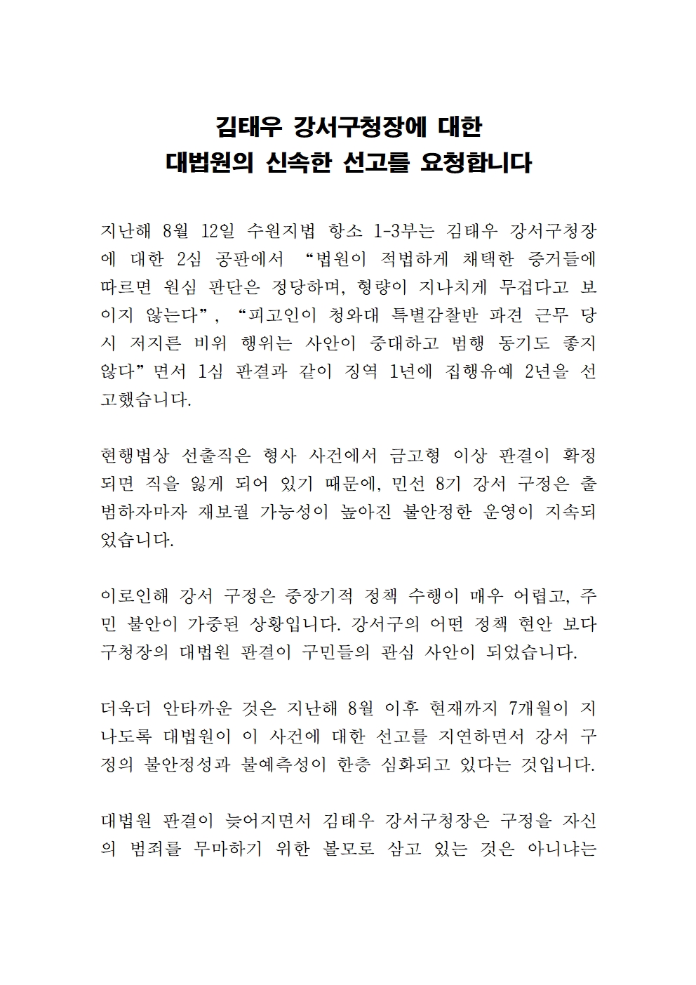 대법원에 촉구합니다. 강서구가 하루빨리 안정을 되찾을 수 있도록 김태우 구청장의 비위 사건에 대한 신속한 선고를 요청합니다.