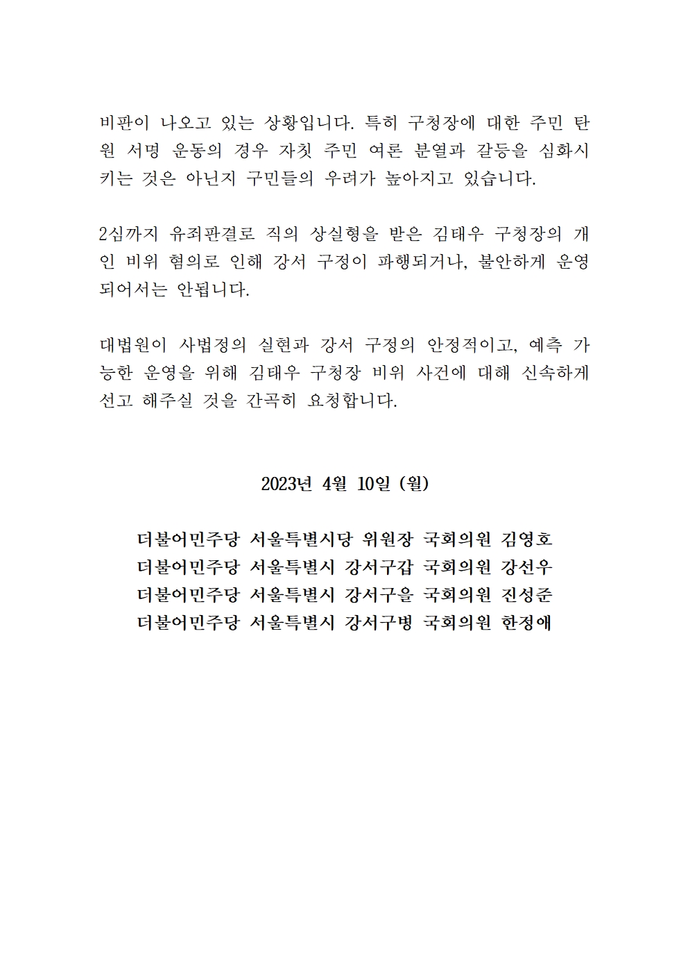 대법원에 촉구합니다. 강서구가 하루빨리 안정을 되찾을 수 있도록 김태우 구청장의 비위 사건에 대한 신속한 선고를 요청합니다.