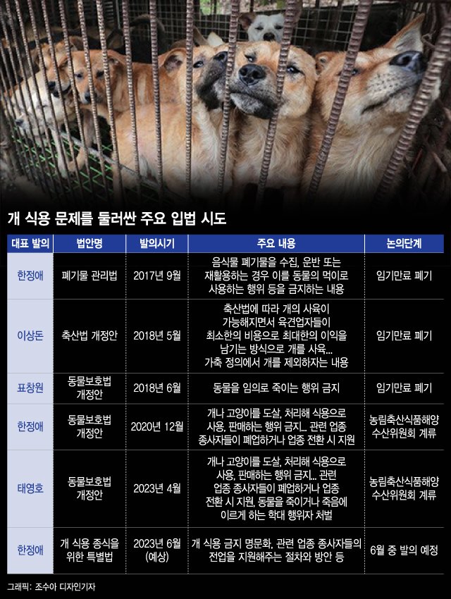 윤석열 대통령 부부가 개 식용 반대 입장을 밝힌 가운데 여야가 앞다퉈 개 식용 금지 입법 시도에 나섰다. 더불어민주당에선 관련 특별법 제정안을 준비 중이고, 국민의힘에서도 개고기 판매 금지를 포함한 동물보호 강화 법안이 발의됐다.