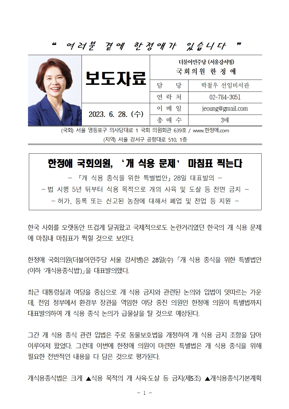 230628_(한정애의원 보도자료)_한정애 국회의원, '개 식용 문제' 마침표 찍는다.hwp