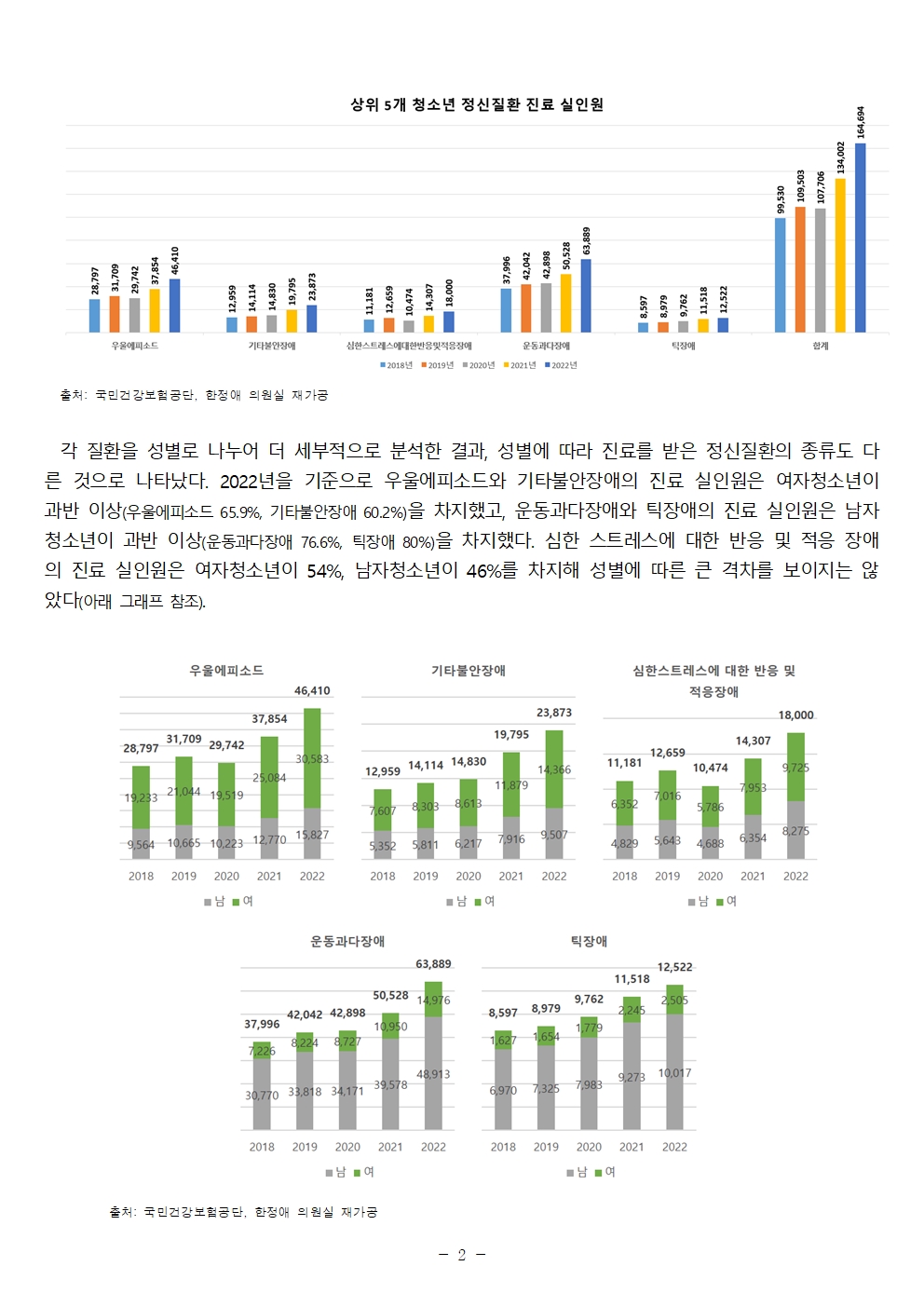 성별에 따른 청소년 정신건강 격차가 천지 차이인 것으로 나타났다. 더불어민주당 한정애 국회의원(서울 강서병, 국회 보건복지위원회 소속)이 국민건강보험공단으로부터 제출받은 국정감사 요구자료인 ‘상위 5개 청소년 정신질환의 연령별·성별 진료 실인원 현황’을 분석한 결과, 최근 5년간 (2018년~2022년) 우울에피소드와 기타불안장애로 진료를 받은 청소년의 과반 이상은 여자청소년이었고 성장할수록 환자 수가 증가하는 반면, 운동과다장애(ADHD)와 틱장애로 진료를 받은 청소년의 과반 이상은 남자청소년이었고 성장할수록 환자 수가 감소했다.