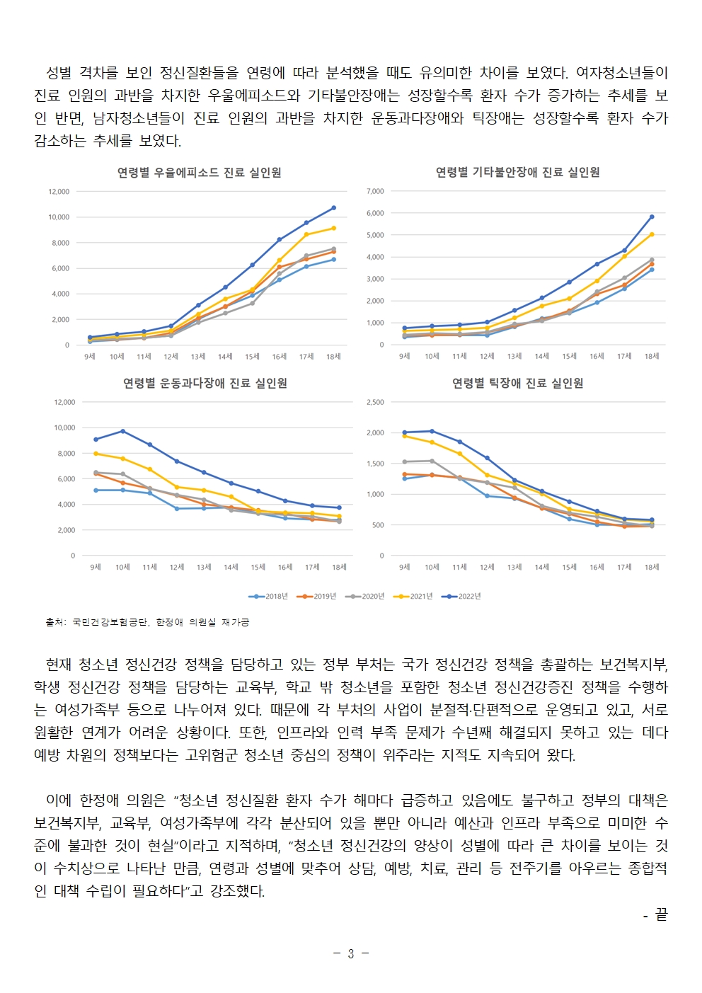 성별에 따른 청소년 정신건강 격차가 천지 차이인 것으로 나타났다. 더불어민주당 한정애 국회의원(서울 강서병, 국회 보건복지위원회 소속)이 국민건강보험공단으로부터 제출받은 국정감사 요구자료인 ‘상위 5개 청소년 정신질환의 연령별·성별 진료 실인원 현황’을 분석한 결과, 최근 5년간 (2018년~2022년) 우울에피소드와 기타불안장애로 진료를 받은 청소년의 과반 이상은 여자청소년이었고 성장할수록 환자 수가 증가하는 반면, 운동과다장애(ADHD)와 틱장애로 진료를 받은 청소년의 과반 이상은 남자청소년이었고 성장할수록 환자 수가 감소했다.