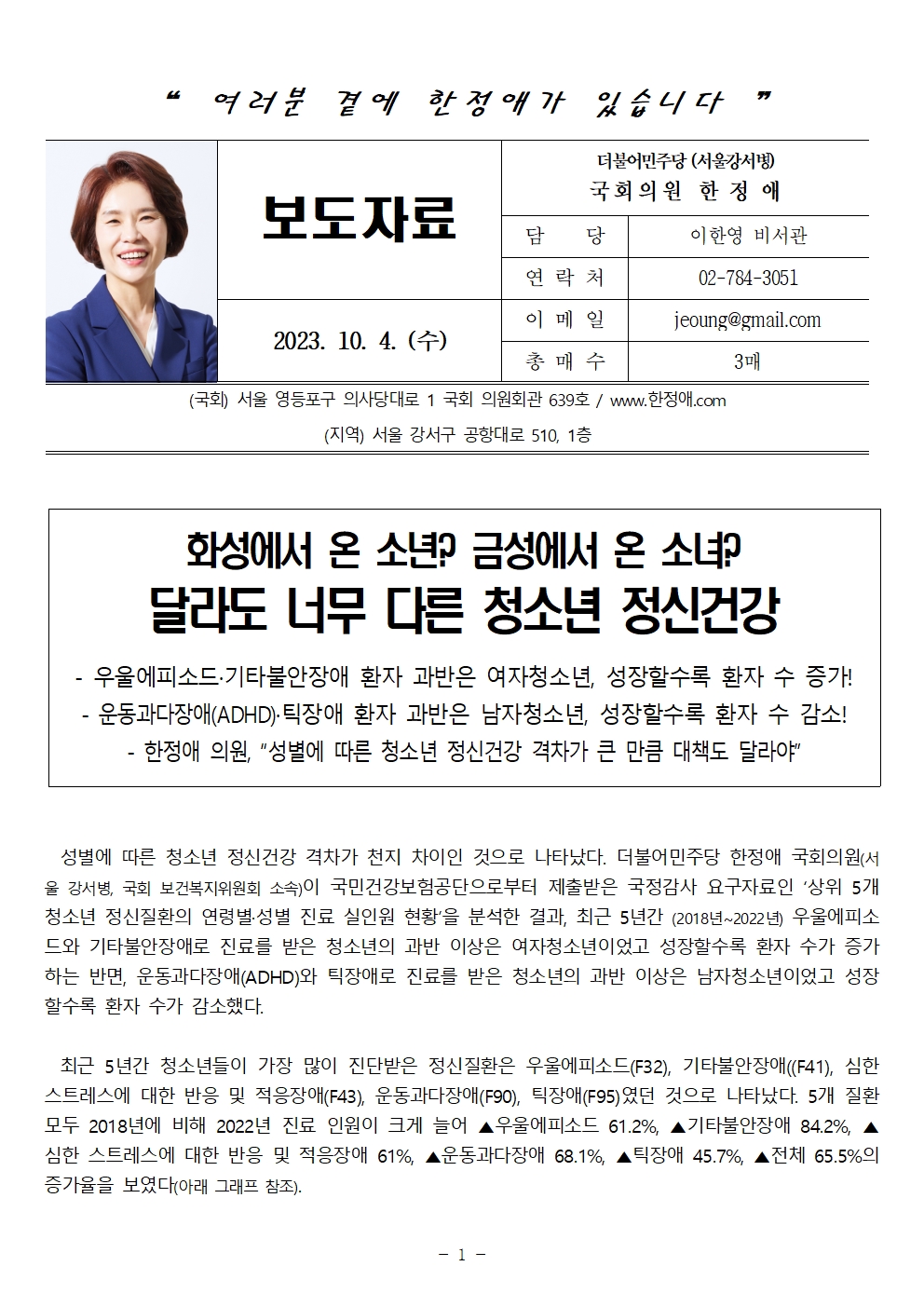 231004 [한정애 의원 보도자료] 청소년 정신건강 성별에 따라 천지차이.hwp