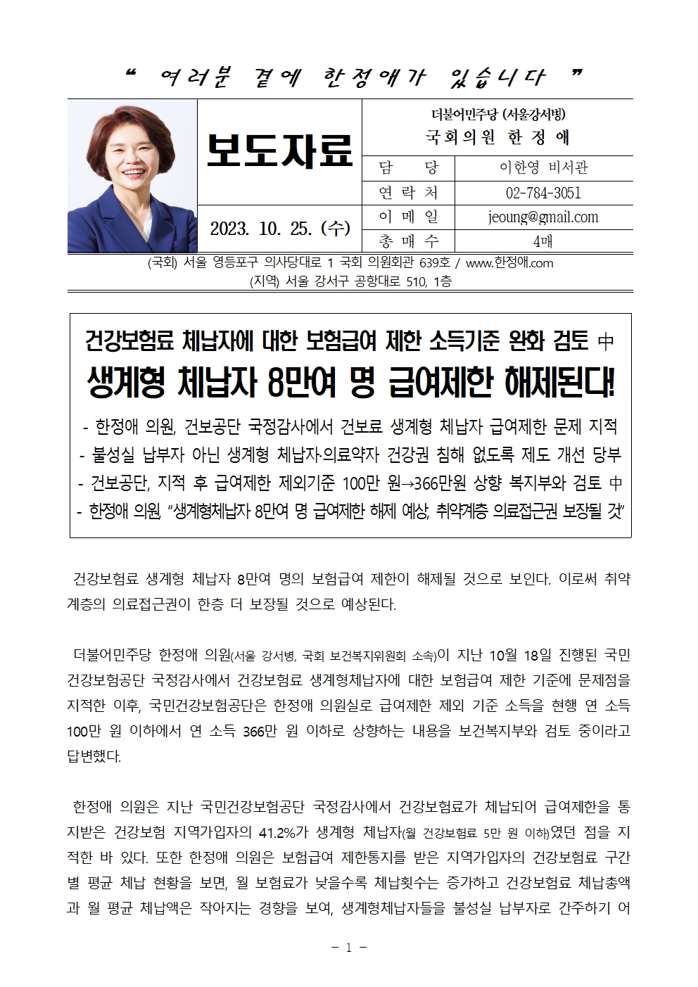 231025 [한정애 의원 국정감사 보도자료] 건보료 체납자 급여 제한 기준 완화 검토, 8만 여명 급여제한 해제된다.hwp