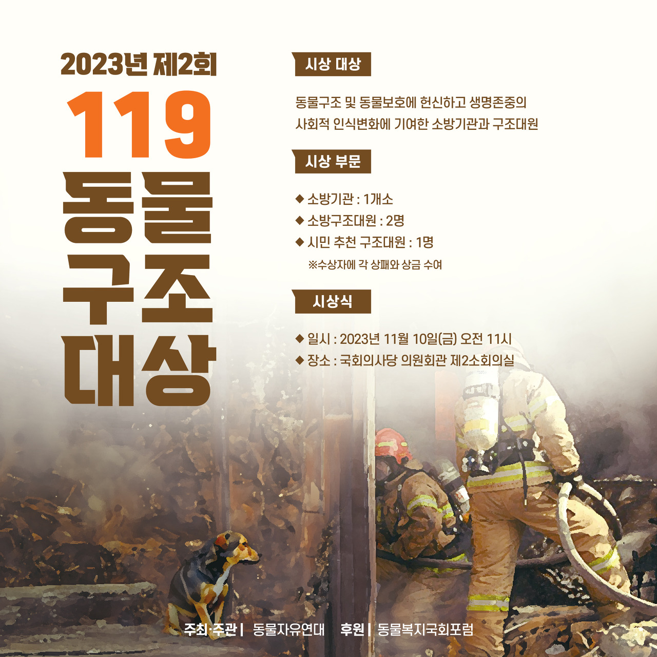 동물구조 및 동물보호에 헌신하고 사회적 인식 변화에 노력한 소방관서 및 소방구조대원을 대상으로 제2회 119동물구조대상을 시행합니다.