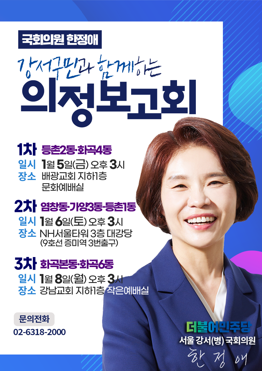 21대 국회에서의 정치활동과 성과를 시작으로, 강서구 내의 핵심 사업의 진행 사항부터 추진 현황까지 소상히 설명드릴 예정이니 구민 여러분들께서 꼭 함께해 주시길 당부드립니다.