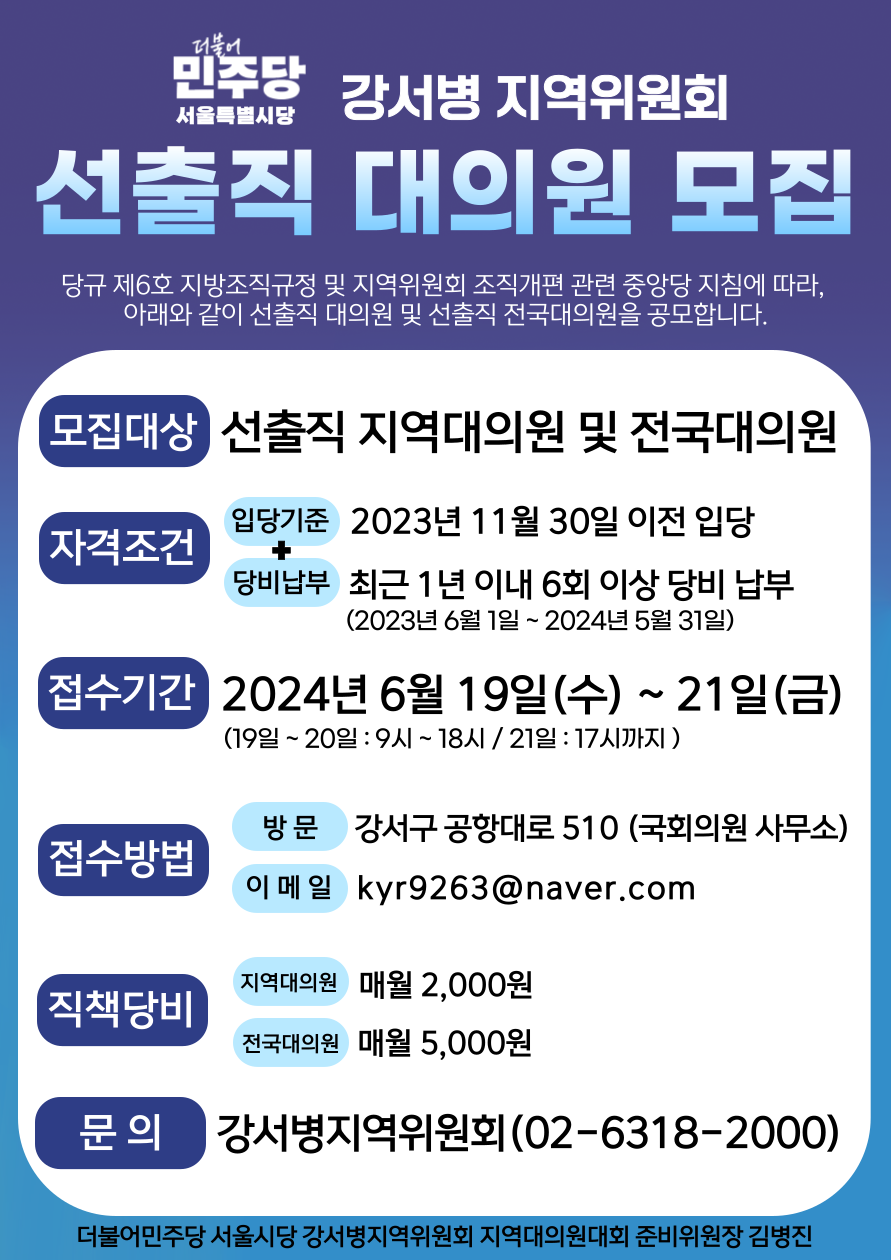 [강서소식] 더불어민주당 서울특별시당 강서병지역위원회 선출직(지역·전국)대의원 모집 공고