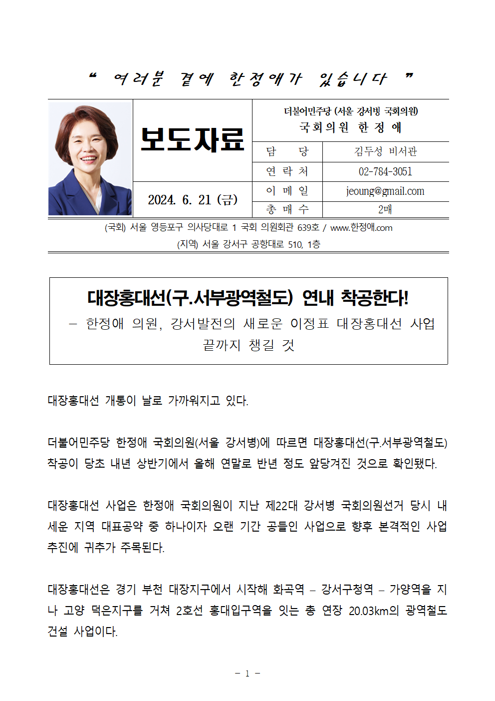 240621_[한정애 의원 보도자료] 대장홍대선(구.서부광역철도) 연내 착공(최종).hwp