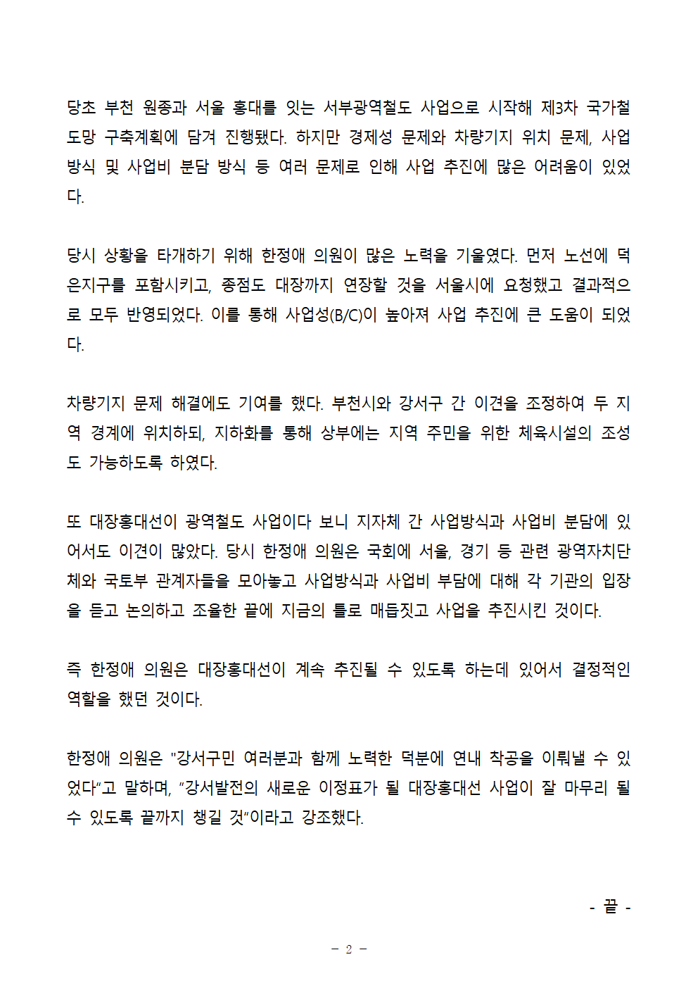 한정애 의원은 "강서구민 여러분과 함께 노력한 덕분에 연내 착공을 이뤄낼 수 있었다“고 말하며, ”강서발전의 새로운 이정표가 될 대장홍대선 사업이 잘 마무리 될 수 있도록 끝까지 챙길 것“이라고 강조했다.