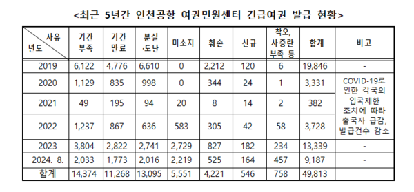발급 사유별로는 △기간부족 1만4374건 △분실·도난 1만3095건 △기간 만료 1만1268건 △미소지 5551건 △훼손 4221건 △착오 758건 △신규발급 546건 순이다. 이 중 분실·도난을 제외한 74%가 여행객 개인의 부주의로 발급된 것이다.