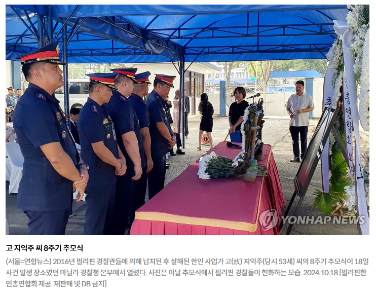 (서울=연합뉴스) 성도현 기자 = 필리핀 현직 경찰관이 연루된 고(故) 지익주(당시 53세) 씨 피살 사건과 관련해 우리 정부가 "영사 조력을 제공하겠다"는 입장만 유지하고 있어 배상 문제 등에 적극적인 대응이 필요하다는 지적이 제기된다.