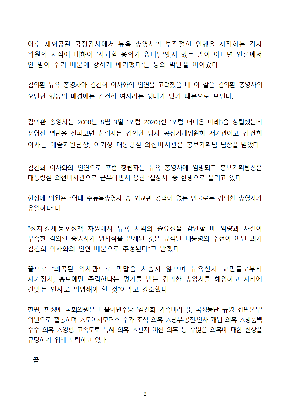 한정애 의원은 “역대 주뉴욕총영사 중 외교관 경력이 없는 인물로는 김의환 총영사가 유일하다”며 “정치·경제·동포정책 차원에서 뉴욕 지역의 중요성을 감안할 때 역량과 자질이 부족한 김의환 총영사가 영사직을 맡게된 것은 윤석열 대통령의 추천이 아닌 과거 김건희 여사와의 인연 때문으로 추정된다”고 말했다.