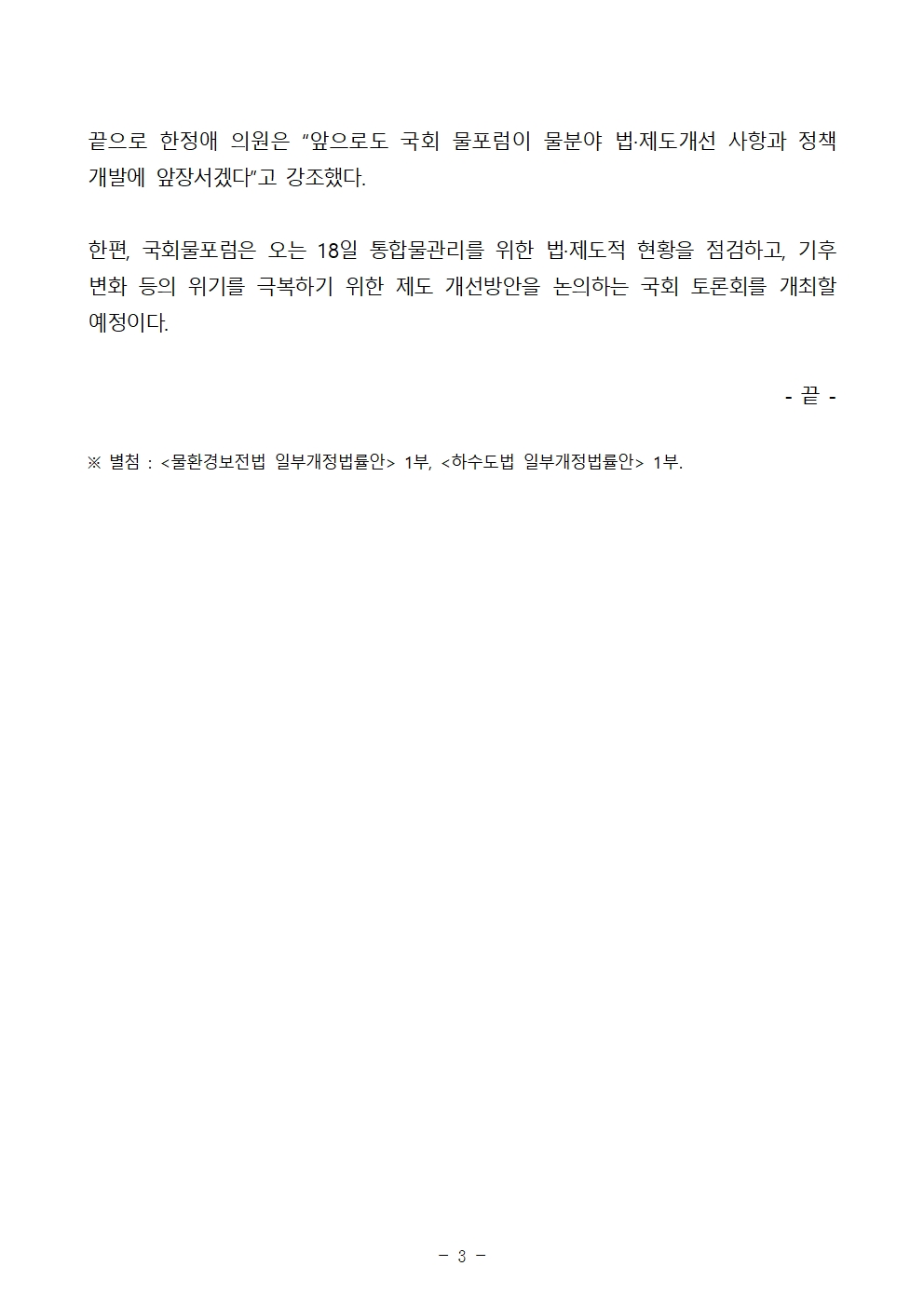 끝으로 한정애 의원은 “앞으로도 국회 물포럼이 물분야 법·제도개선 사항과 정책 개발에 앞장서겠다”고 강조했다.