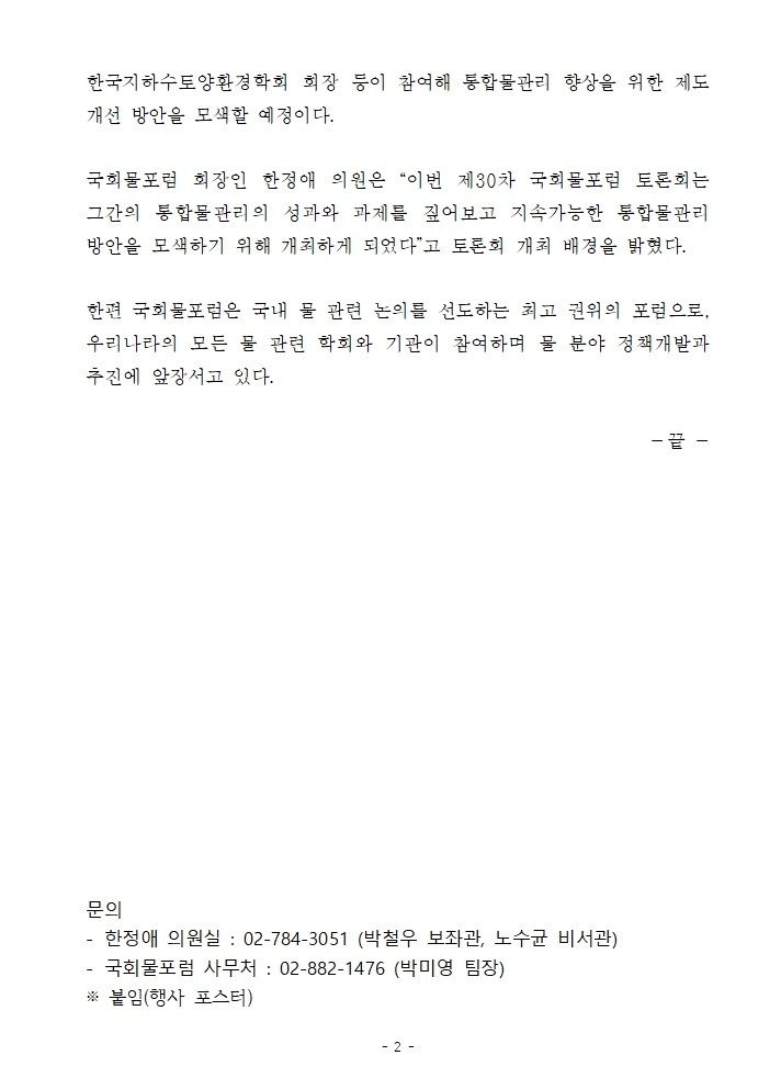 [보도자료] 국회물포럼 오는 18일,‘통합물관리 향상을 위한 법·제도적 개선방안 모색’국회 토론회 개최