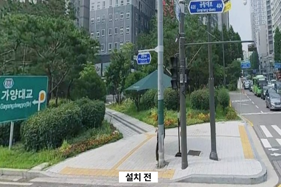 강서구청 사거리 교통섬 내 옥외용 벤치를 설치하여 보행자들에게 신호 대기 중에 잠시 쉴 수 있는 공간을 마련하고 안전한 보행을 위해 횡단보도 주변 통행에 지장이 없는 곳을 선정해 의자를 설치하였습니다.