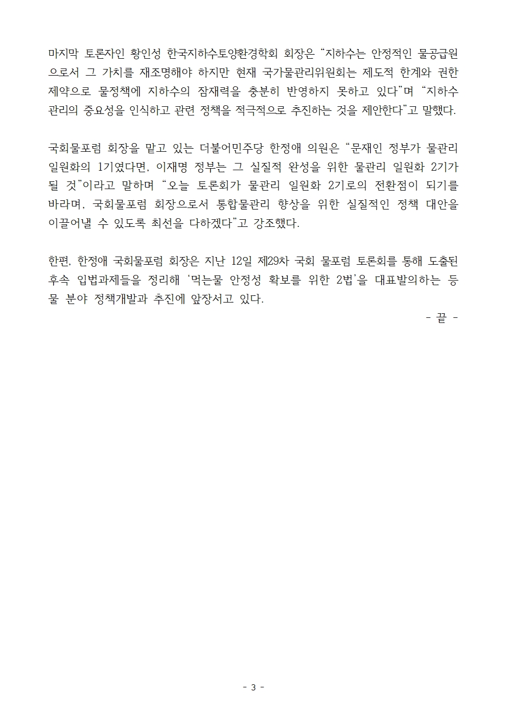 [보도자료] 국회물포럼,‘통합물관리 향상을 위한 법·제도적 개선방안 마련을 위한’국회 토론회 성료