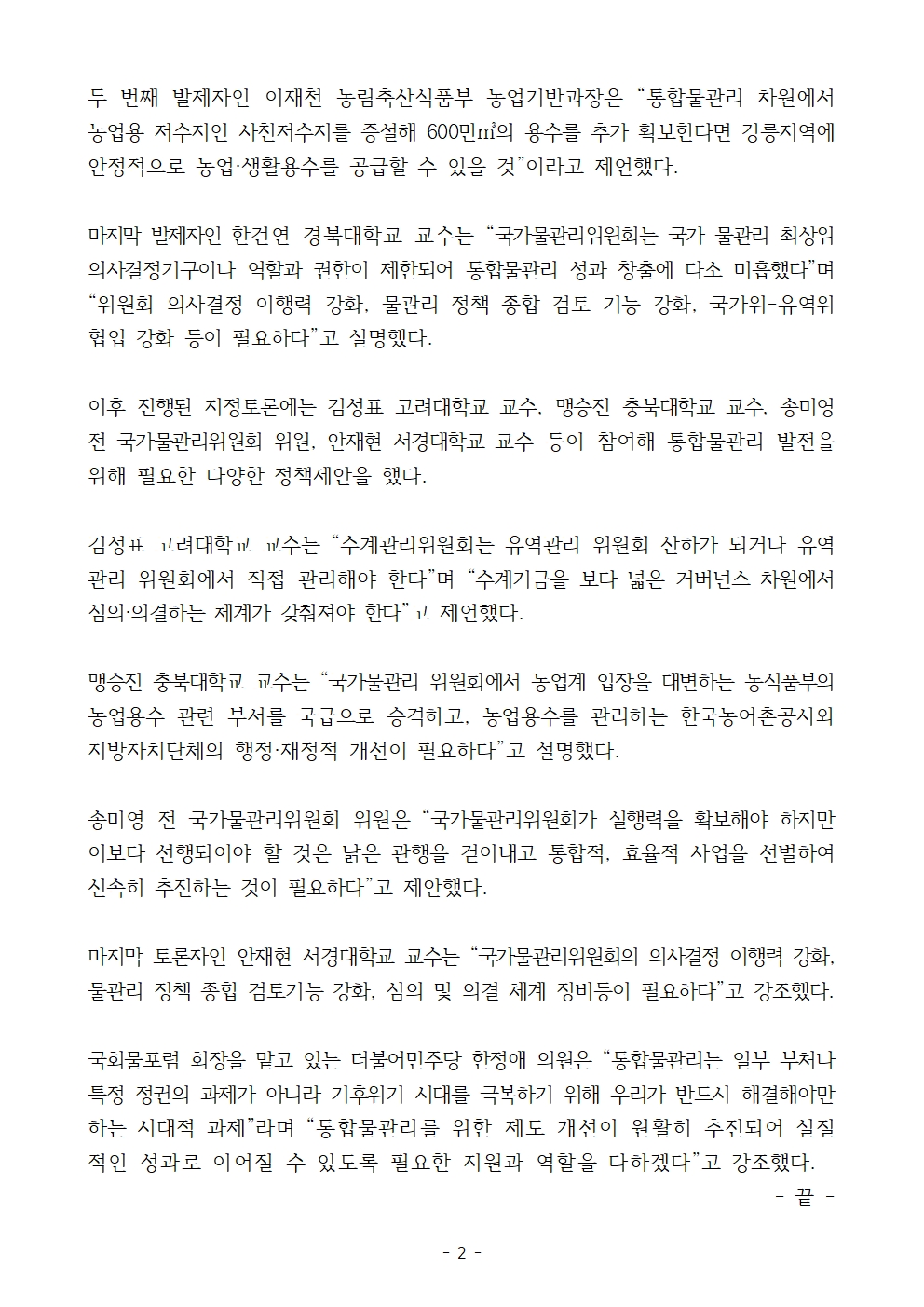 토론회(좌장 최진용 서울대 교수, 국가물관리위원회 위원)에서는 이승환 환경부 수자원정책관이 ‘통합물관리 추진 현황 및 정책 방향’을 발표하고, 이재천 농림축산식품부 농업기반과장이 ‘농업용수 분야 통합물관리 추진 현황 및 계획’을 한건연 경북대학교 교수가 ‘국가물관리위원회 2기 성과와 개선 방안’을 발표했다.