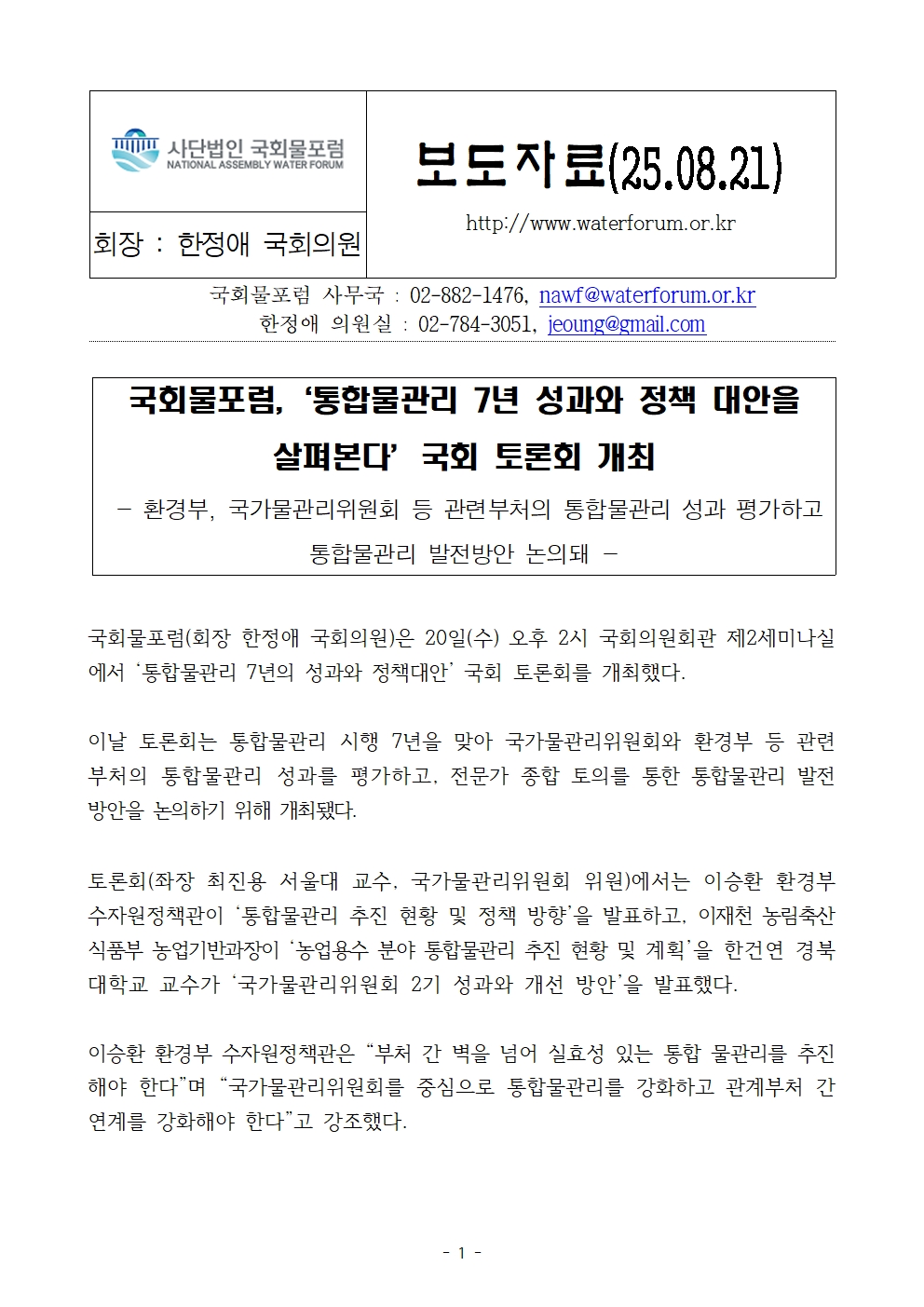 250821_(국회물포럼 보도자료) ‘통합물관리 7년 성과와 정책 대안을 살펴본다’ 국회 토론회 개최.hwp