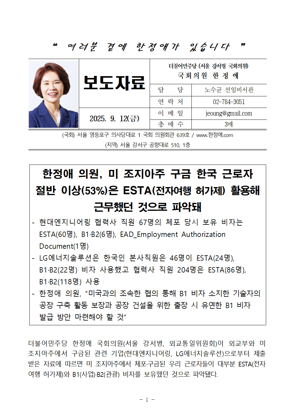 [보도자료] 한정애 의원, 미 조지아주 구금 한국 근로자 절반 이상(53%)은 ESTA(전자여행 허가제) 활용해 근무했던 것으로 파악돼