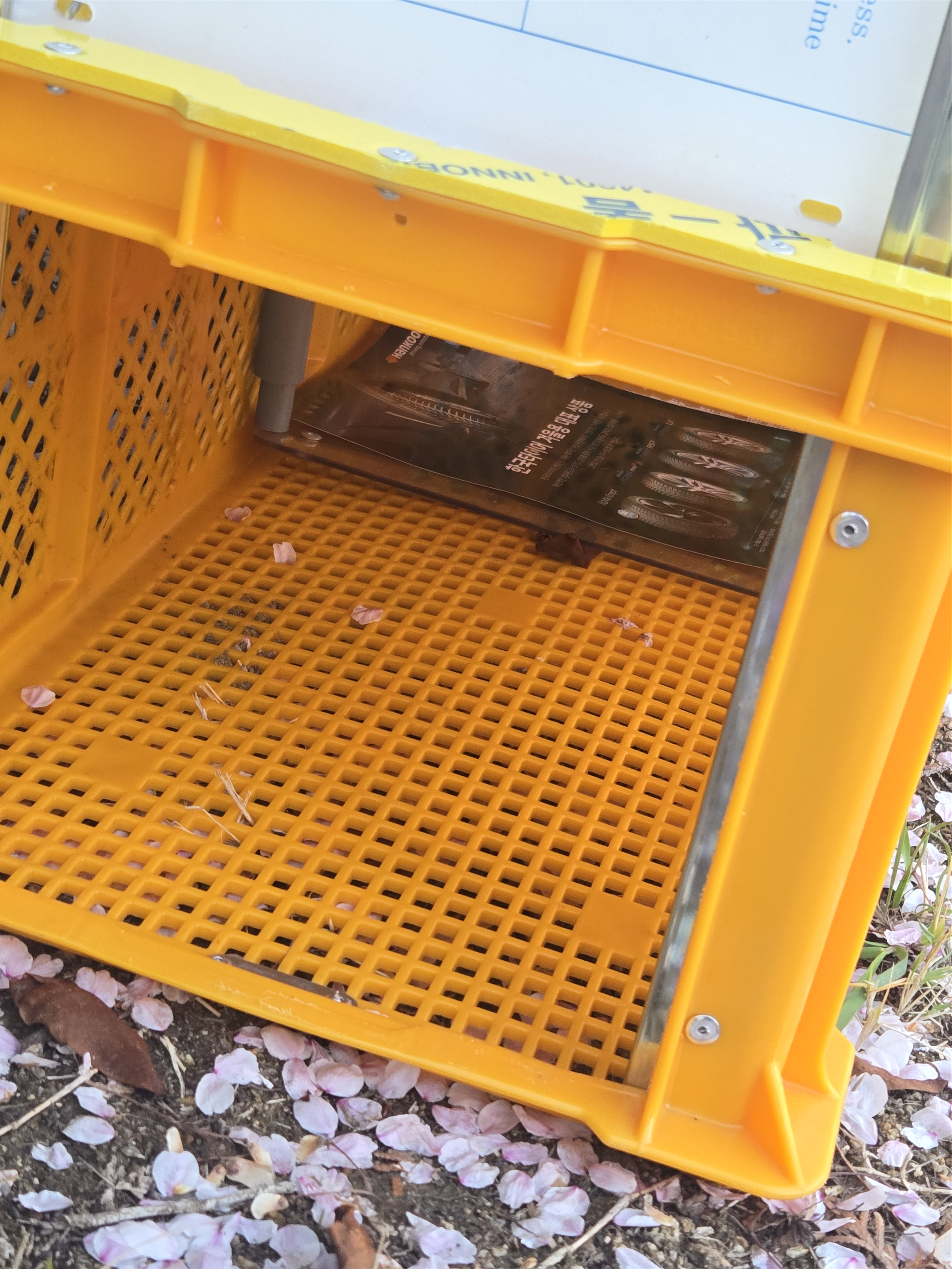 냥이들을 유인하기 위해 급식소 사료를 치우고 대신 포획틀 안에 맛있는 캔을 두었습니다.