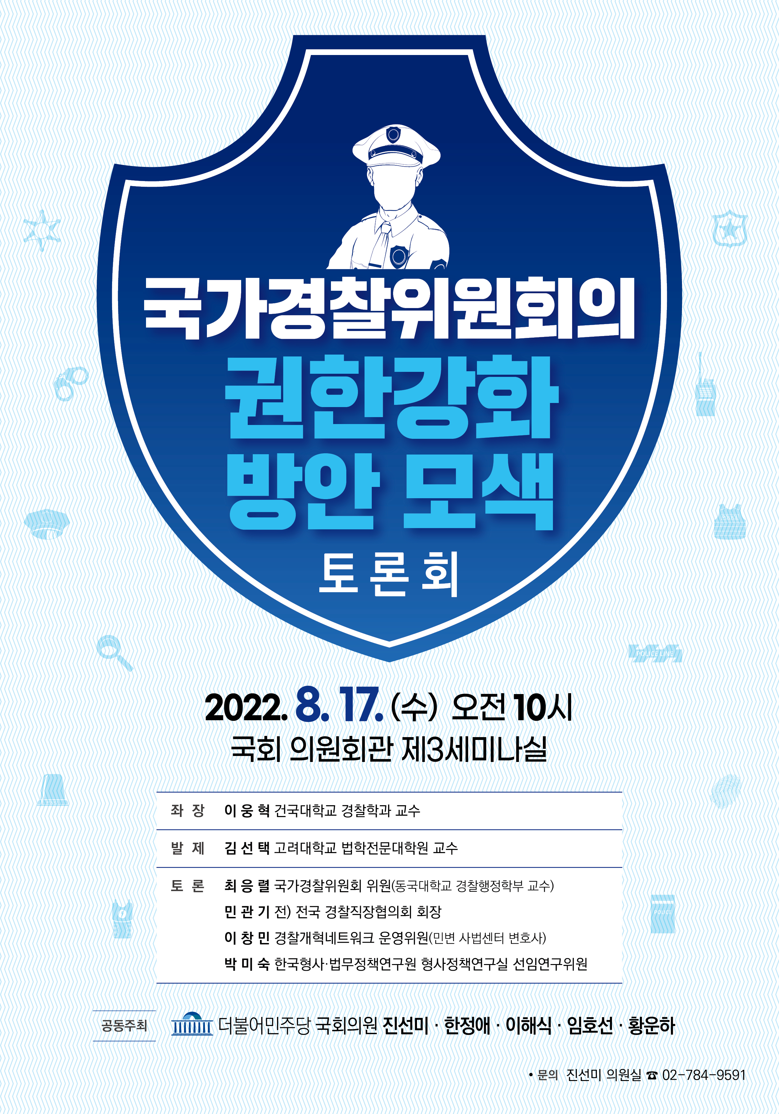 더불어민주당 윤석열정권 경찰장악대책위원장을 맡고있는 한정애 의원은 진선미·이해식·임호선·황운하 의원실과 함께 17일(수) '국가경찰위원회의 권한강화 방안 모색'을 위한 토론회를 개최합니다.