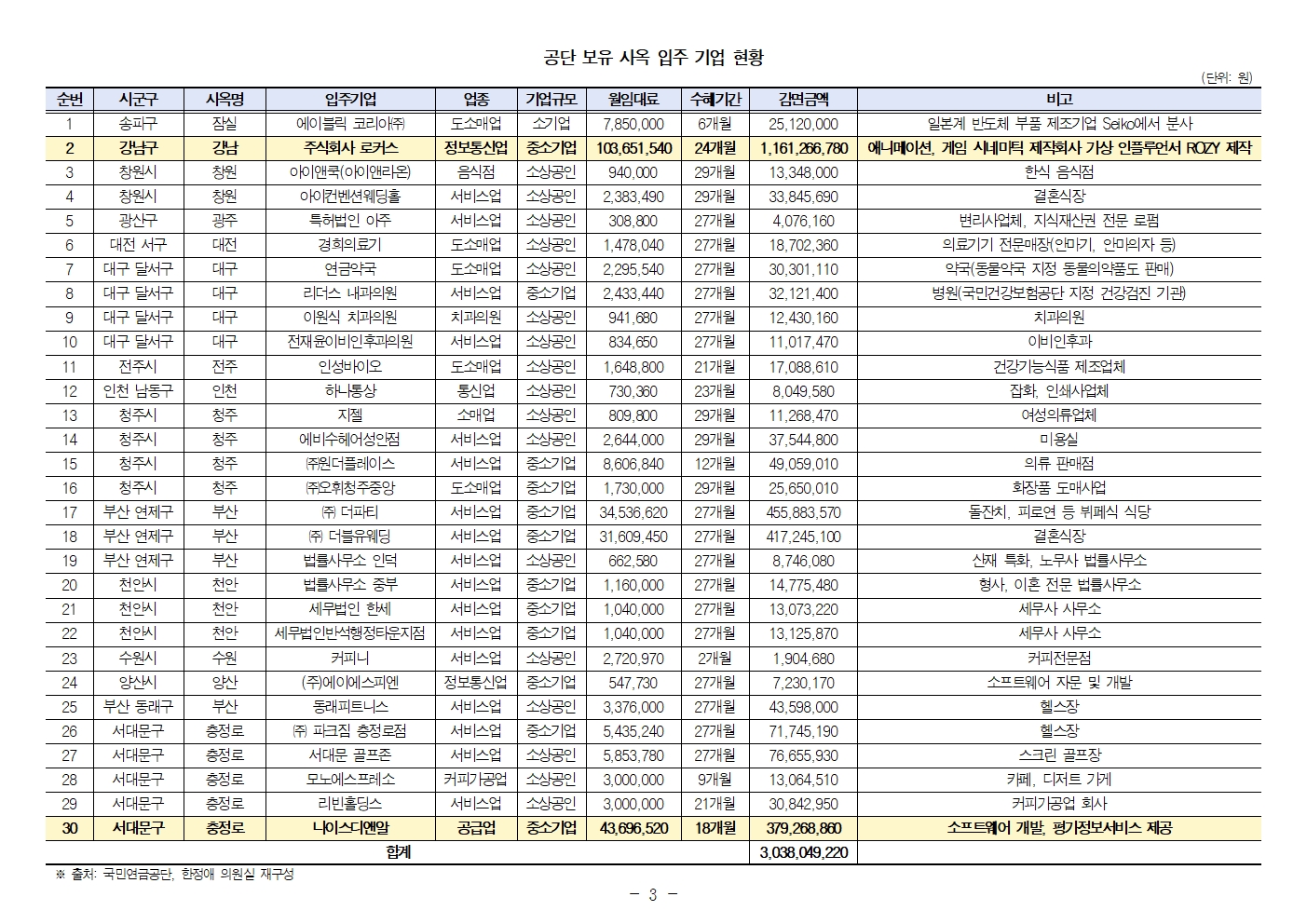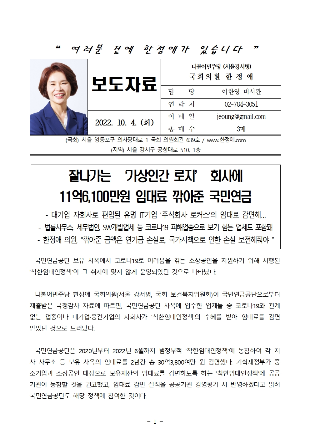 더불어민주당 한정애 국회의원(서울 강서병, 국회 보건복지위원회)이 국민연금공단으로부터 제출받은 국정감사 자료에 따르면, 국민연금공단 사옥에 입주한 업체들 중 코로나19와 관계없는 업종이나 대기업·중견기업의 자회사가 ‘착한임대인정책’의 수혜를 받아 임대료를 감면 받았던 것으로 드러났다.