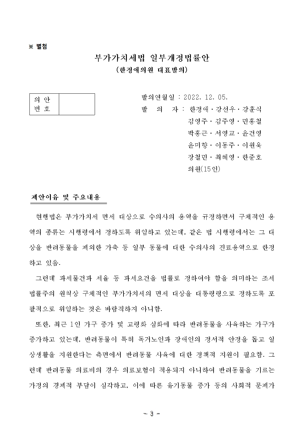 더불어민주당 한정애 국회의원(서울 강서병, 국회 보건복지위원회)이 ‘반려동물의 동물병원 진료비 중 부가가치세 10%를 면제’하는 「부가가치세법」 일부개정법률안을 대표발의했다(12월 5일, 별첨 개정안 참조).