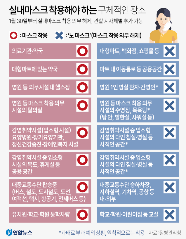 마스크 착용 의무화 도입('20.10.) 이후, 1월 30일(월)부터 실내 마스크 의무가 조정되었습니다.