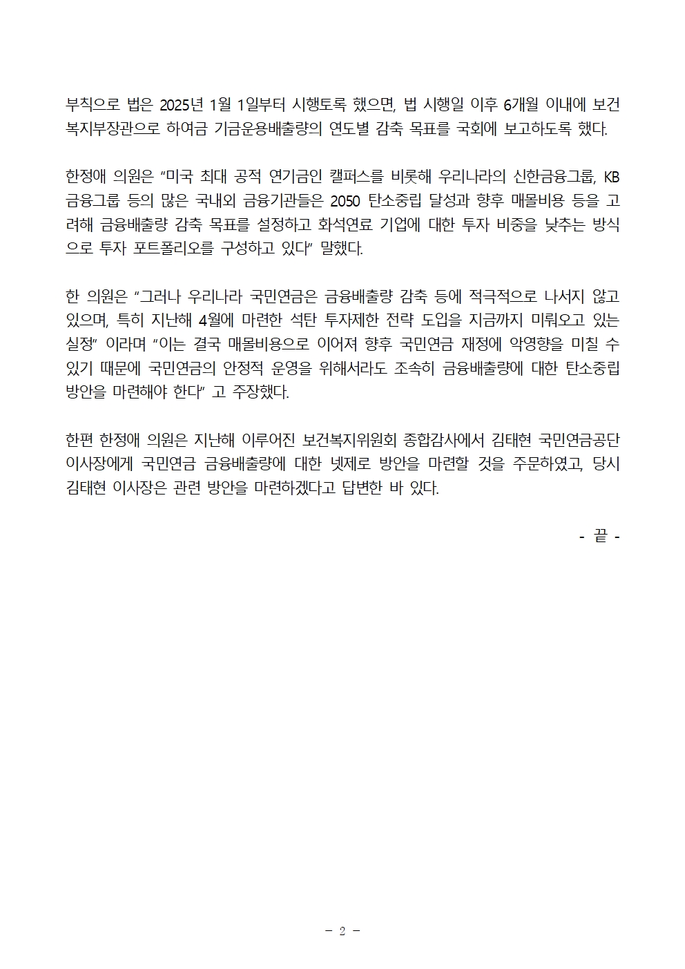 [보도자료] 한정애 의원, 국민연금 탄소중립 법제화 추진
