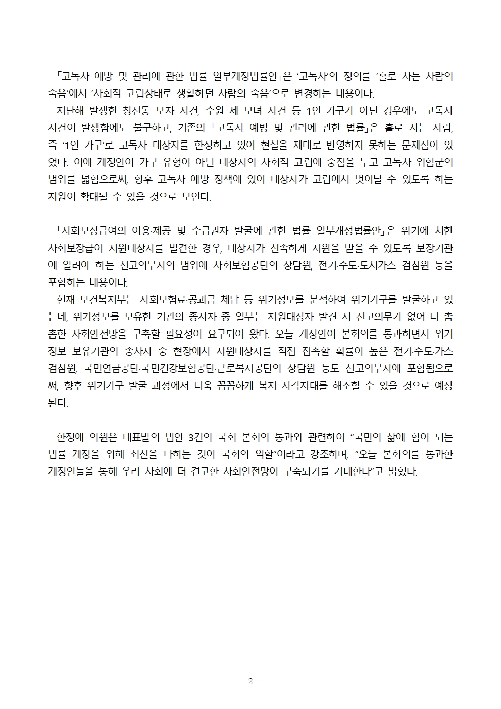 [보도자료] 영유아보육법·고독사법·사회보장급여법한정애 의원 대표발의 법률안 3건 국회 본회의 통과!