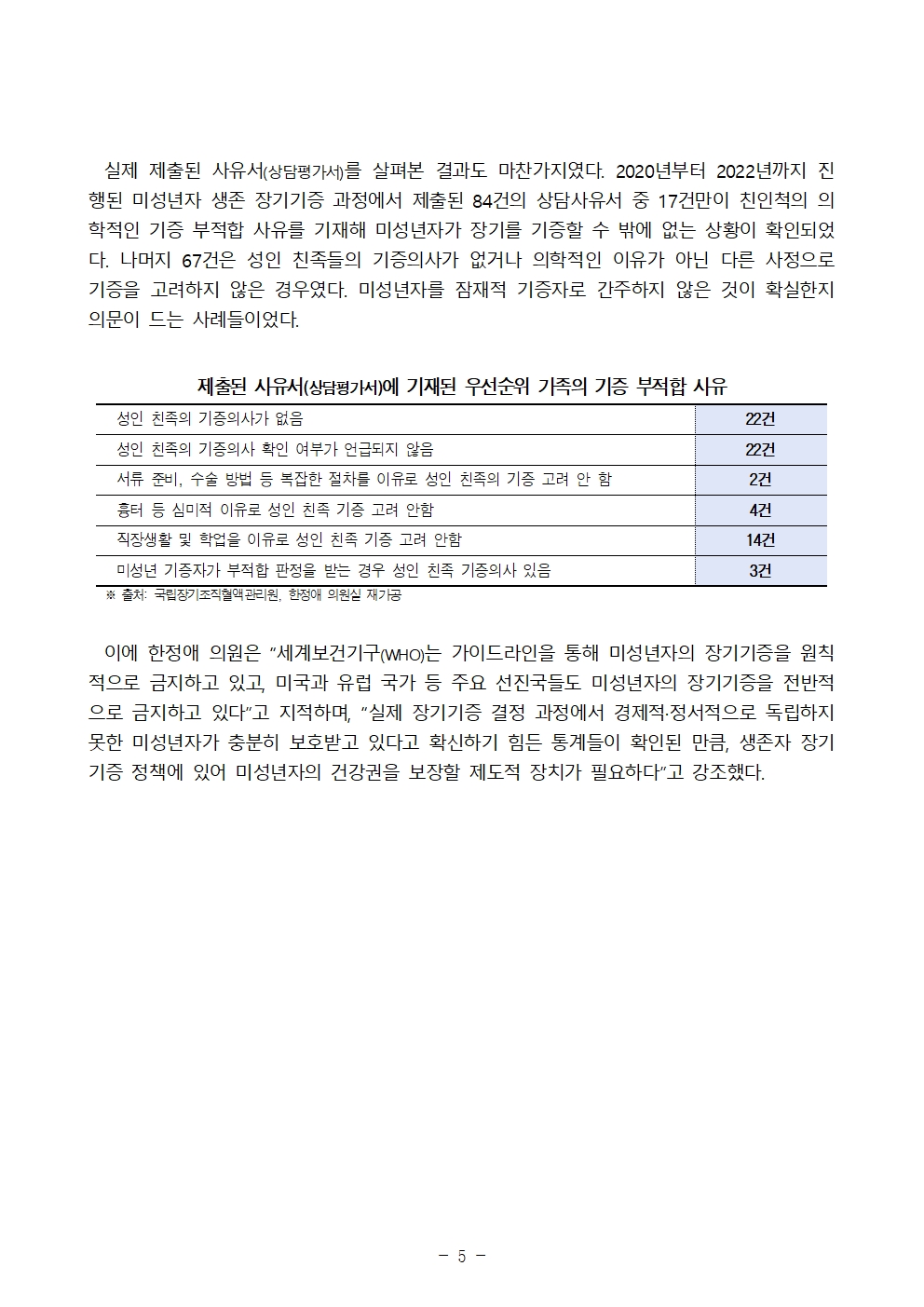 [보도자료] 미성년자 생존 장기기증 받은 5명 중 4명,뇌사 장기이식 대기등록조차 안해