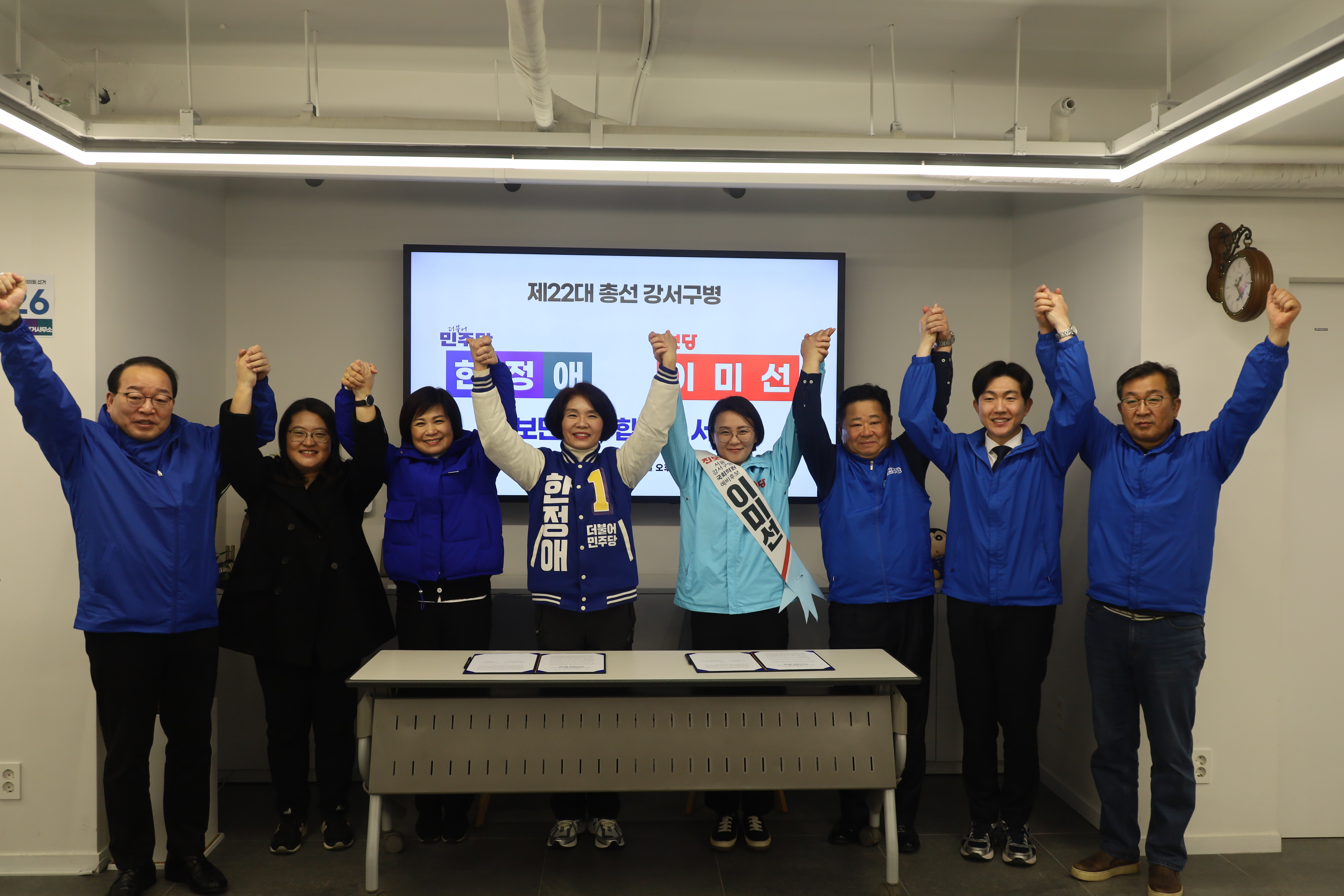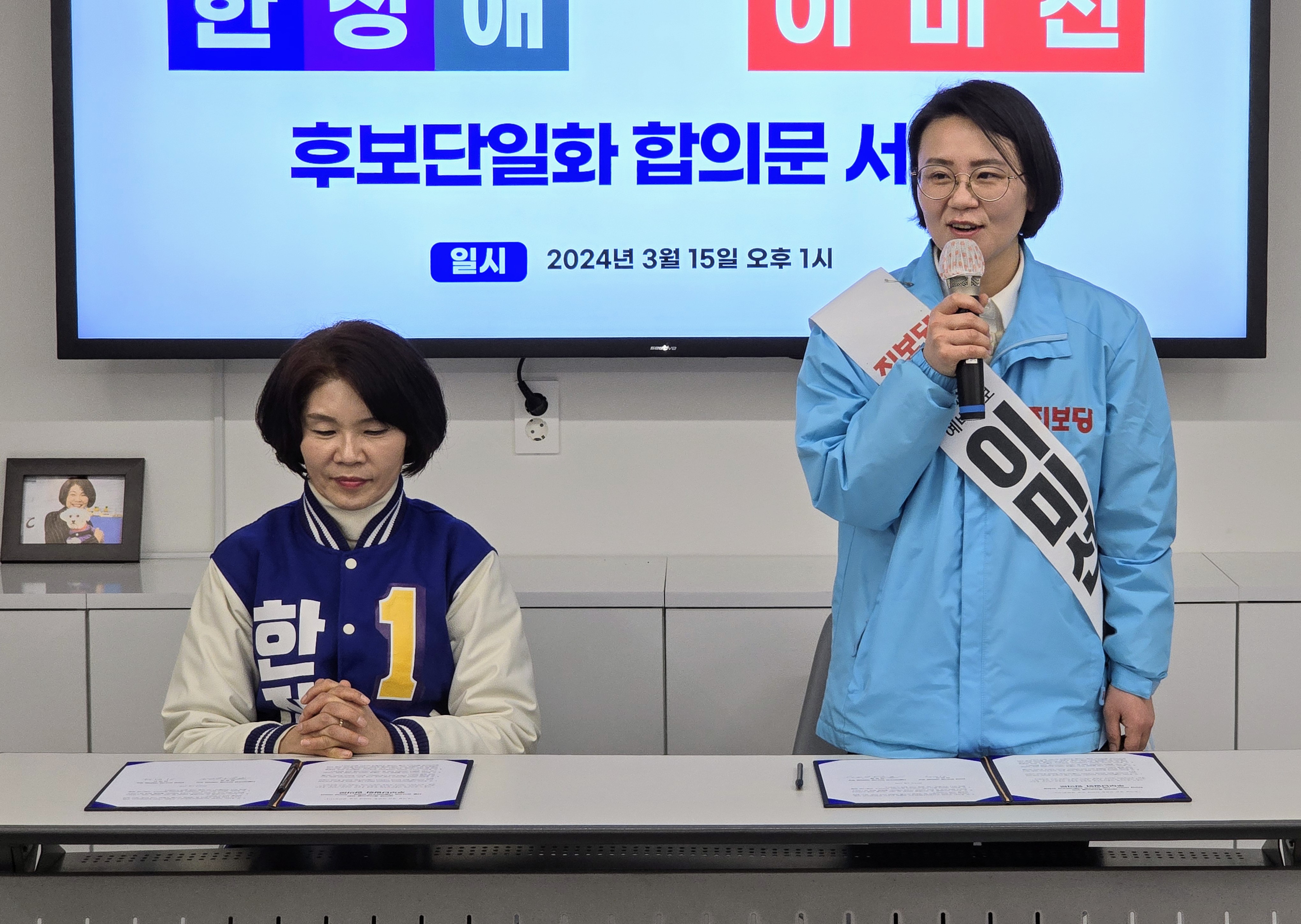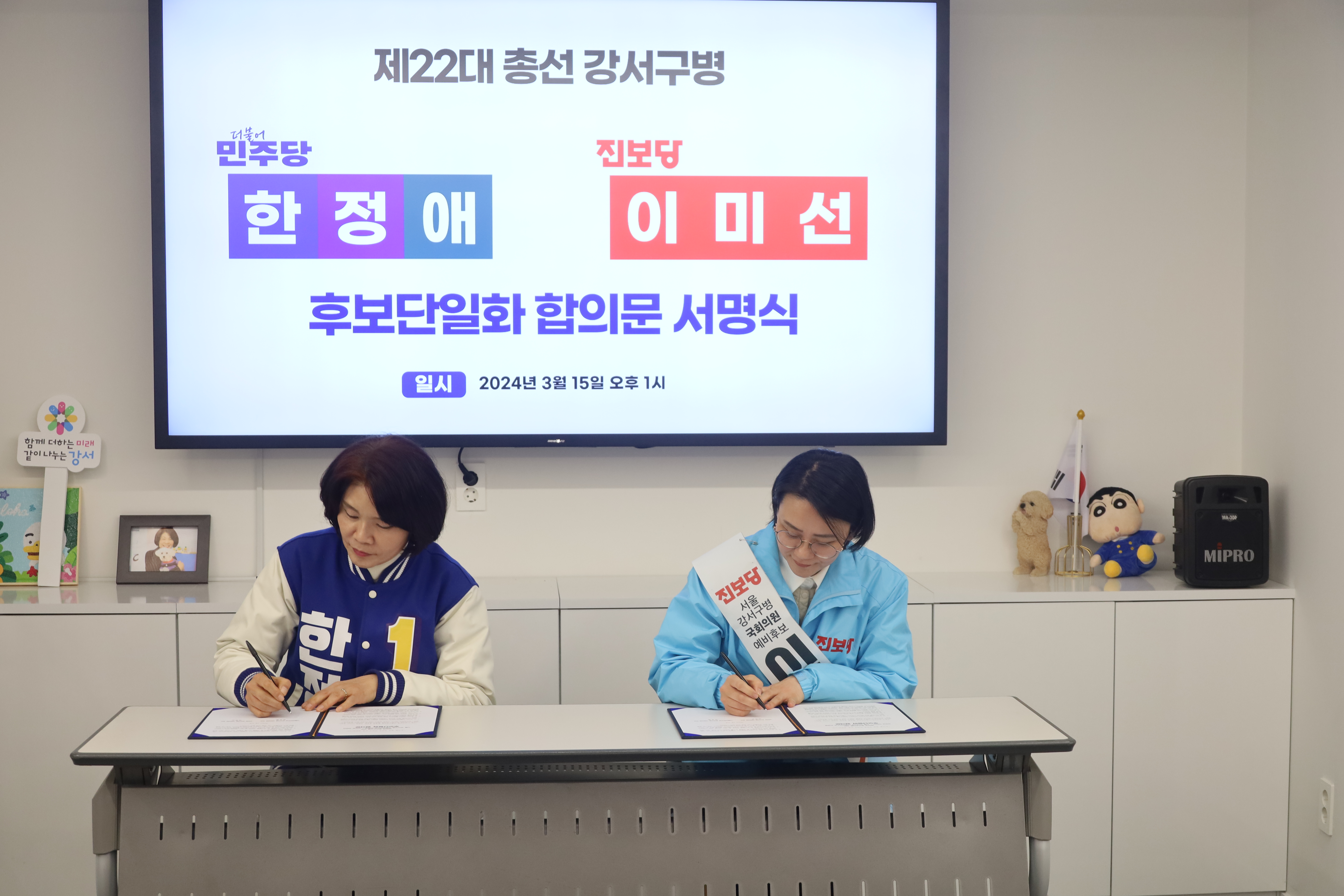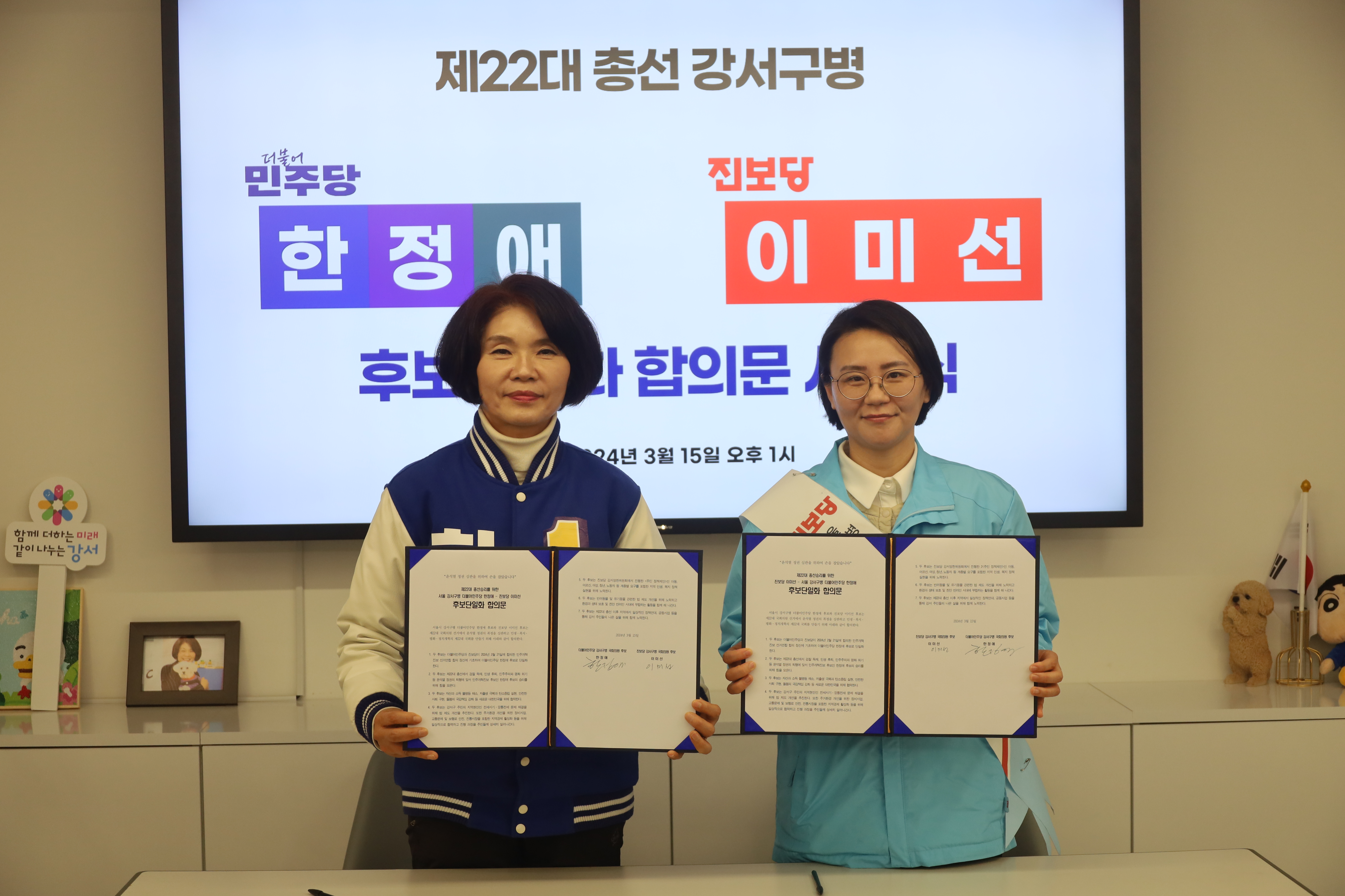 오늘 오후, 한정애 후보 선거사무소에서 진보당의 이미선 후보와 '서울 강서병 야권 후보 단일화'에 합의했습니다.