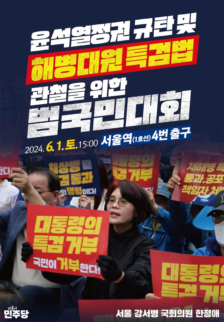 6월 1일(토) 오후 3시, 윤석열정권 규탄 및 해병대원 특검법 관철을 위한 범국민대회에 함께 해 주십시오.
